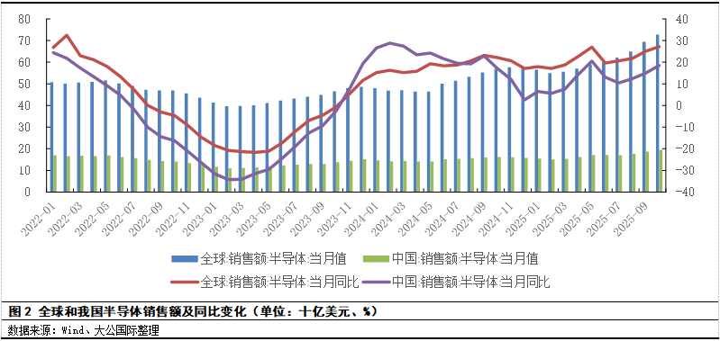 2025年1~10月,全球半导体行业销售额及我国半导体行业销售额分别以21.98%、12.86%的速度继续增长,我国半导体销售额占全球的比重为27.68%,占比超过四分之一,表明世界半导体增量高度依赖中国市场,我国在全球半导体市场中具备一定的规模优势。但需要注意的是,我国半导体行业增速仍低于全球约9个百分点,侧面反映出产品仍以成熟制程为主,先进制程产品受限,结构性过剩与高端产能不足并存;AI增长红利相较全球市场获取不足,AI芯片等部分产业集中度低,存在结构性错位。