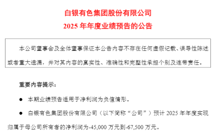 1月23日晚,白银有色(601212)1月23日公告,预计2025年实现归属于母公司所有者的净利润亏损4.5亿元至6.75亿元,上年同期净利润8079.17万元。