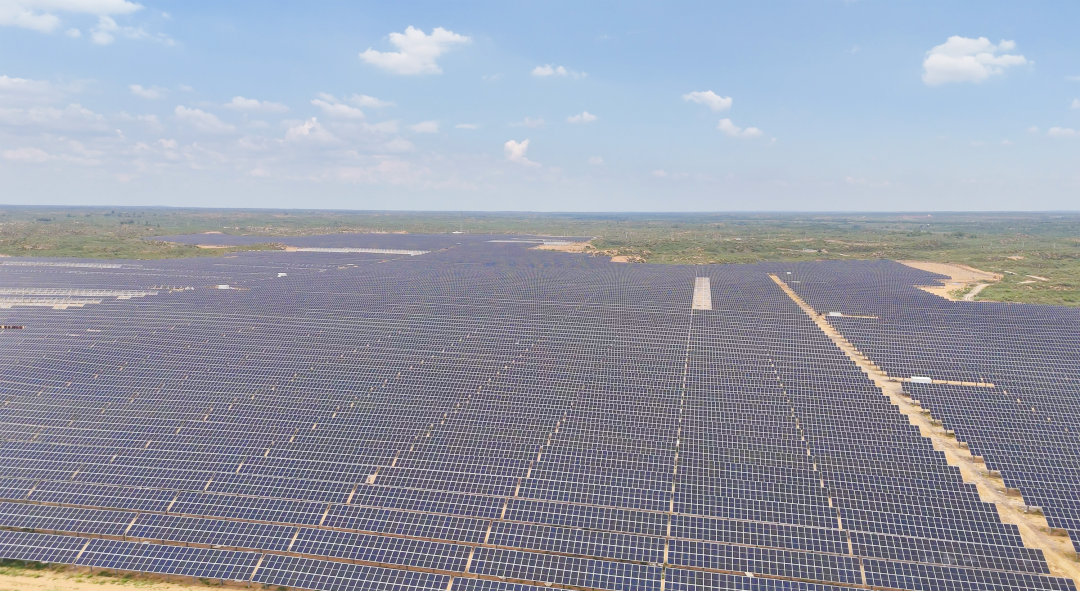 在北元集团科诺光伏电站,连绵的光伏板在阳光下熠熠生辉,宛如一片蓝色的海洋,映照着企业绿色发展的新梦想。