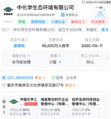 速晨君通过天眼查发现,中化学生态成立于2020年9月,注册资金5个亿,注册地是重庆南岸区长生桥,官网写的双总部,实则主要办公地一直在北京。