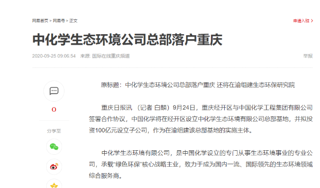 更重要的是,中国化学工程集团的子公司中化学生态环境有限公司(以下简称中化学生态)的总部将从北京搬到重庆!