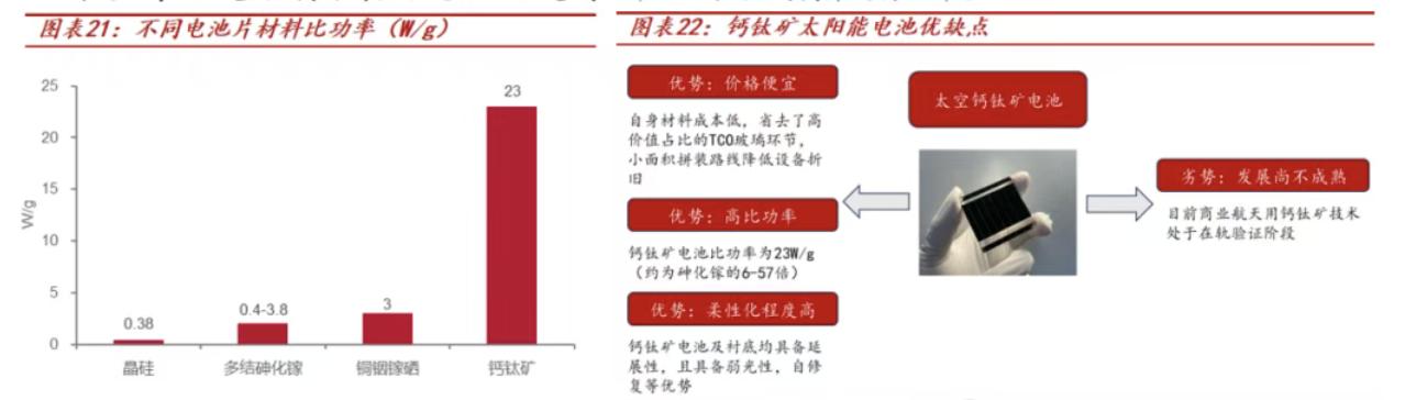 晶硅太阳能电池转化率低、砷化镓太阳能电池成本高,于是行业将目光聚焦至钙钛矿电池上。据了解,钙钛矿电池具有廉价、高比功率等优势,有望成为我国卫星太阳翼新方案。有分析师指出,钙钛矿有望解决核心痛点,成为我国太阳翼下一代主流技术路线。