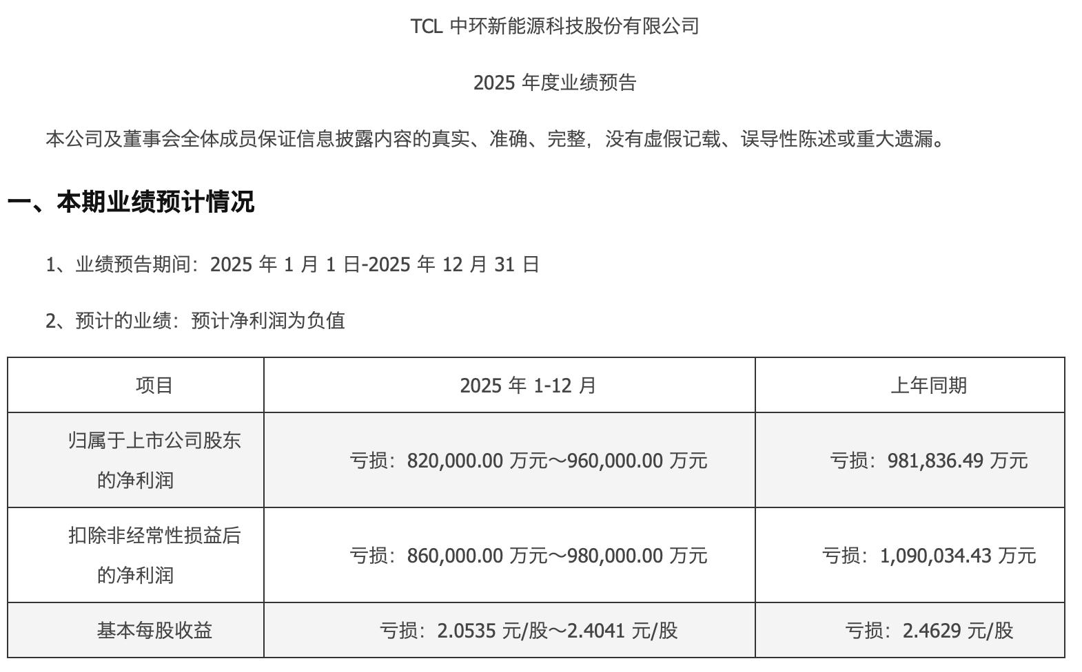 TCL中环业绩预告