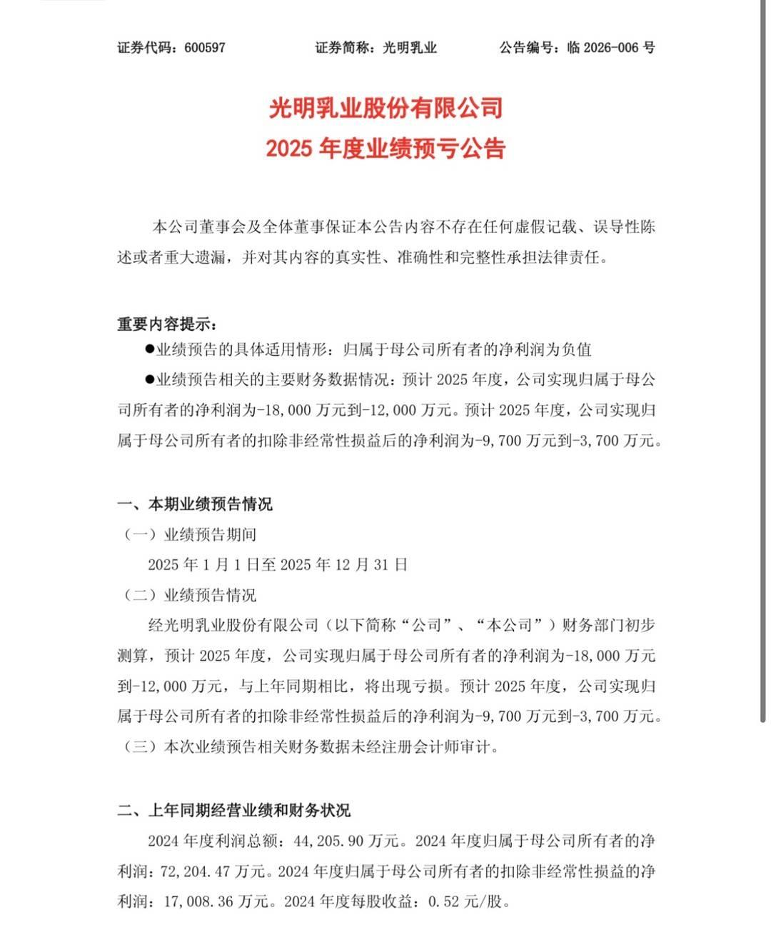 海外资产拖累:光明乳业预计2025年净亏超1亿