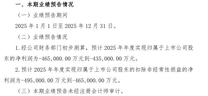 公司近日发布的2025年业绩预告显示,2025年全年归属于上市公司股东的净利润预计亏损43.5亿元至46.5亿元,较2024年的69.5亿元亏损额收窄33%至37%。扣非后净亏损46.5亿至49.5亿元,亏损额同比收窄32%至36%。