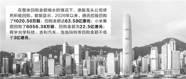 值得注意的是,在整体回购金额缩水的情况下,港股龙头公司依然积极回购。数据显示,2026年以来,腾讯控股回购了1020.50万股,回购金额达63.58亿港元;小米集团回购了6056.38万股,回购金额为22.5亿港元;舜宇光学科技、吉利汽车、泡泡玛特等回购金额不低于3亿港元。