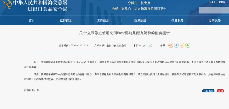 1月22日,海关总署发布消费提示称,目前我国暂未发现兰特黎斯(Lactalis)旗下召回的Picot品牌婴幼儿配方奶粉进口记录。海关总署进出口食品安全局提醒消费者,请立即停止使用个人通过携带、代购等方式可能保有的涉事产品,并密切关注拉克塔利斯公司的后续召回进展,安全理性作出消费选择。