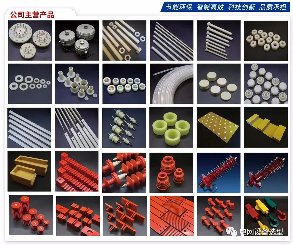 公司主要产品有:35kV~500kV多种规格高强度绝缘紧固件(绝缘螺栓、绝缘螺杆、绝缘螺帽、绝缘垫圈)系列产品;10kV、35kV高、低压硅橡胶复合一体化绝缘套管、环氧树脂套管、避雷器系列产品;多种电压等级和规格绝缘子(主要用于干式变压器及成套设备)系列产品;多种规格互感器的二次接出线板、盒系列产品;多种规格绝缘垫块、绝缘筒、绝缘套、绝缘环系列产品;多种规格压钉碗系列产品;多种规格电力变压器、电抗器铁心油道散热用陶瓷绝缘垫片系列产品。