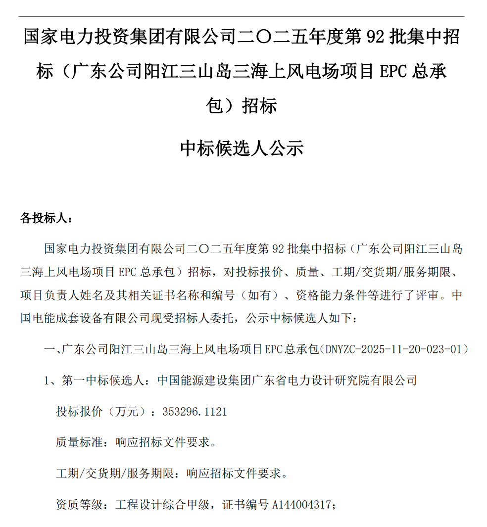 中国风电新闻网讯:1月22日,国家电力投资集团有限公司二〇二五年度第92批集中招标(广东公司阳江三山岛三海上风电场项目EPC总承包)招标中标候选人公示,中国能源建设集团广东省电力设计研究院有限公司预中标,投标报价35.3296亿元。