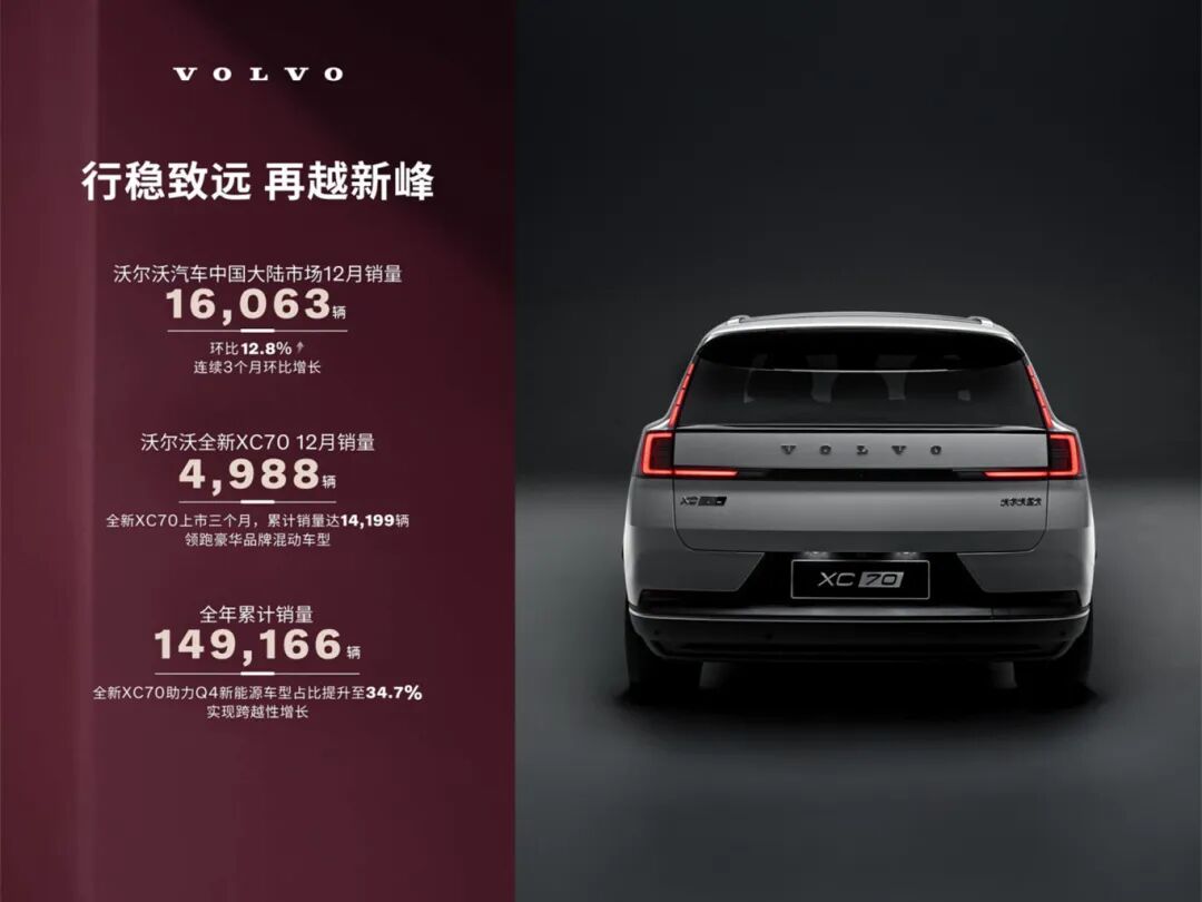 整个2025年,沃尔沃在中国大陆市场的累计销量达到了149,166辆。其中,仅在12月,沃尔沃就卖出了160,063辆新车,实现了月销成绩的环比3连涨。