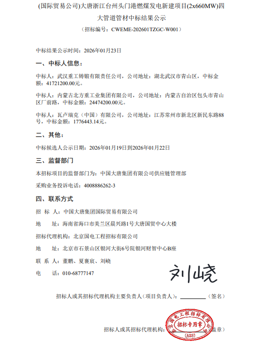 1月23日,中国大唐集团有限公司大唐电子商务平台发布(国际贸易公司)大唐浙江台州头门港燃煤发电新建项目(2x660MW)四大管道管材中标结果公示,详情如下: