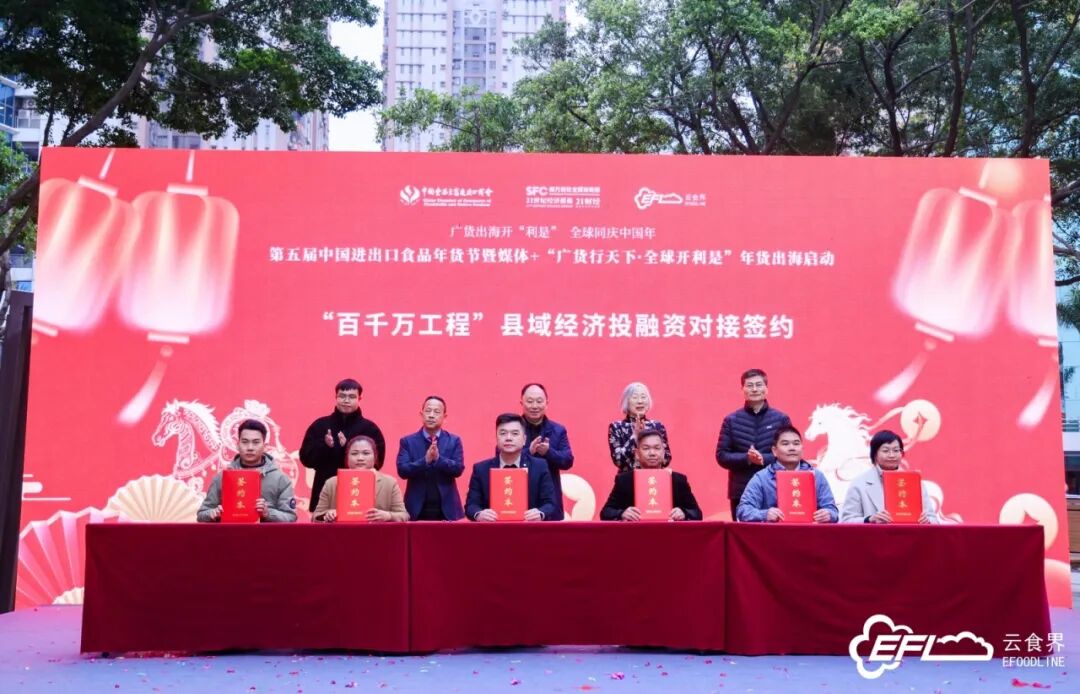 作为本次年货节的重要成果,活动现场完成了一系列扎实的合作签约。五批合作方涵盖新西兰、马来西亚、印尼等RCEP成员国及港澳地区的进出口食品采购商与参展企业,还包括广东省异地商会、省市区行业协会、金融机构以及金牌年菜、物流等产业链相关企业,合作内容广泛覆盖国际采购、跨区域资源对接、跨境供应链协同、外贸金融支持、县域优品投融资对接、产销精准匹配等多个领域。值得一提的是,多家非遗食品企业以联合签约形式积极参与其中,共同探索传统广货与现代外贸模式创新融合的发展新路径。