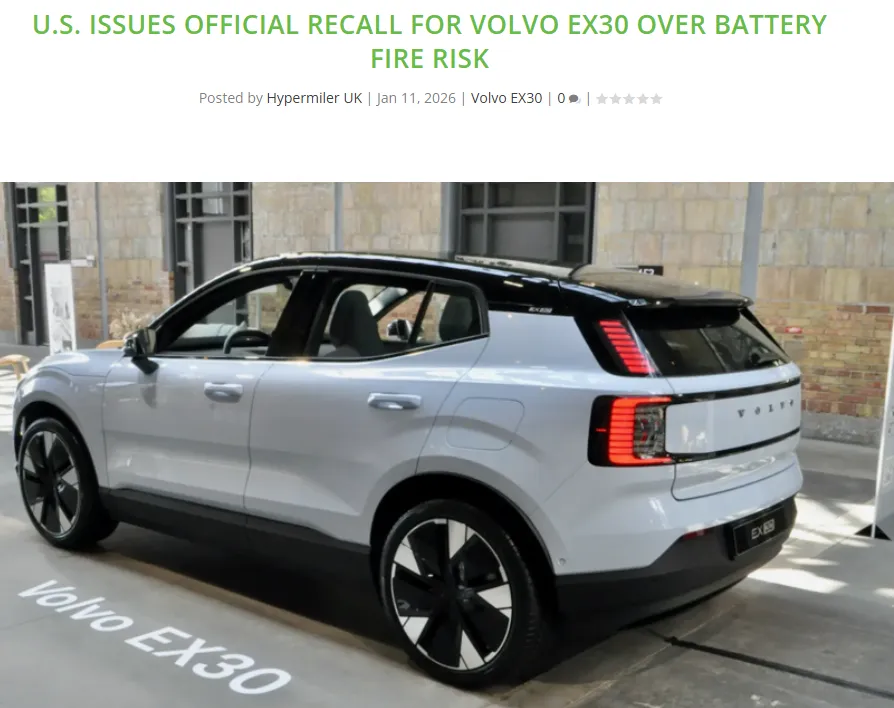 2026年1月11日,据外媒报道,美国已正式确认召回2025款沃尔沃EX30,这是该问题首次在联邦层面得到承认。此次召回已向美国国家公路交通安全管理局(NHTSA)提交,召回编号为26V001。召回的根本原因是EX30的高压电池存在缺陷,可能导致电池短路和过热,从而增加起火风险。此后,加拿大、澳大利亚、爱尔兰等国纷纷宣布召回。