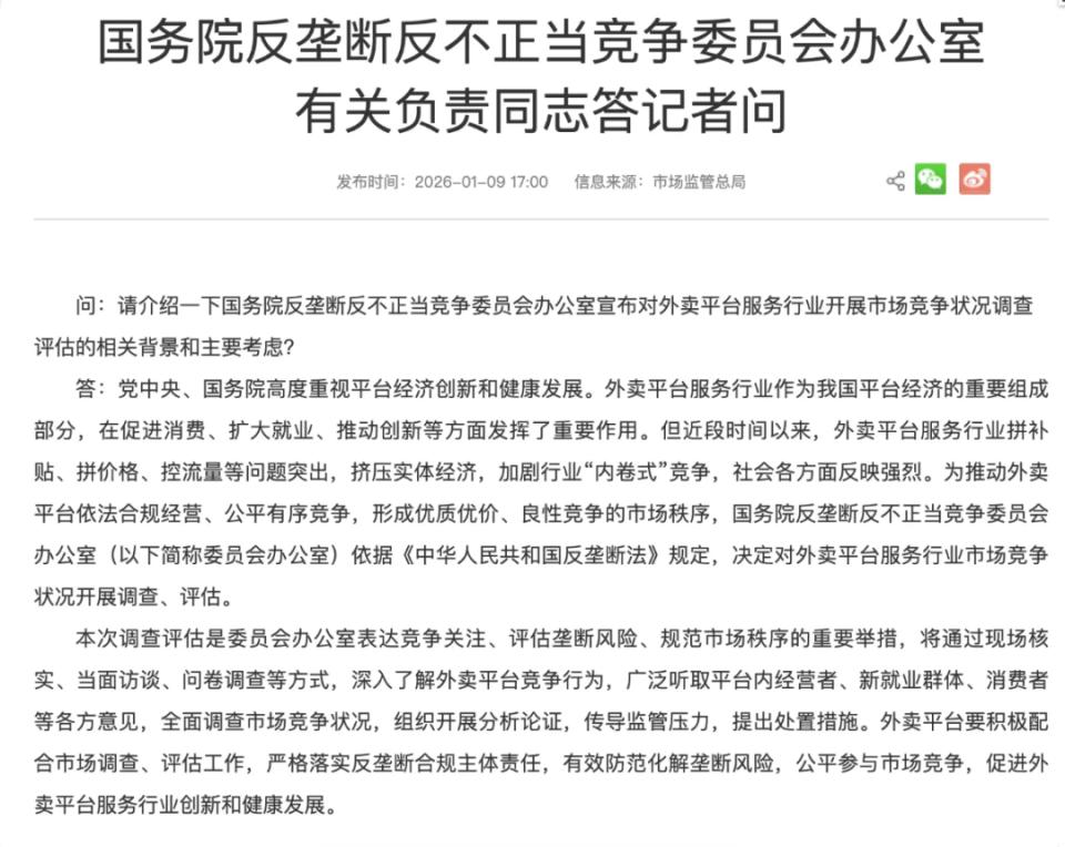 正是在这一背景下,1 月 9 日,国务院反垄断反不正当竞争委员会办公室(简称"国务院双反办")宣布对外卖平台服务行业开展市场竞争状况调查与评估。