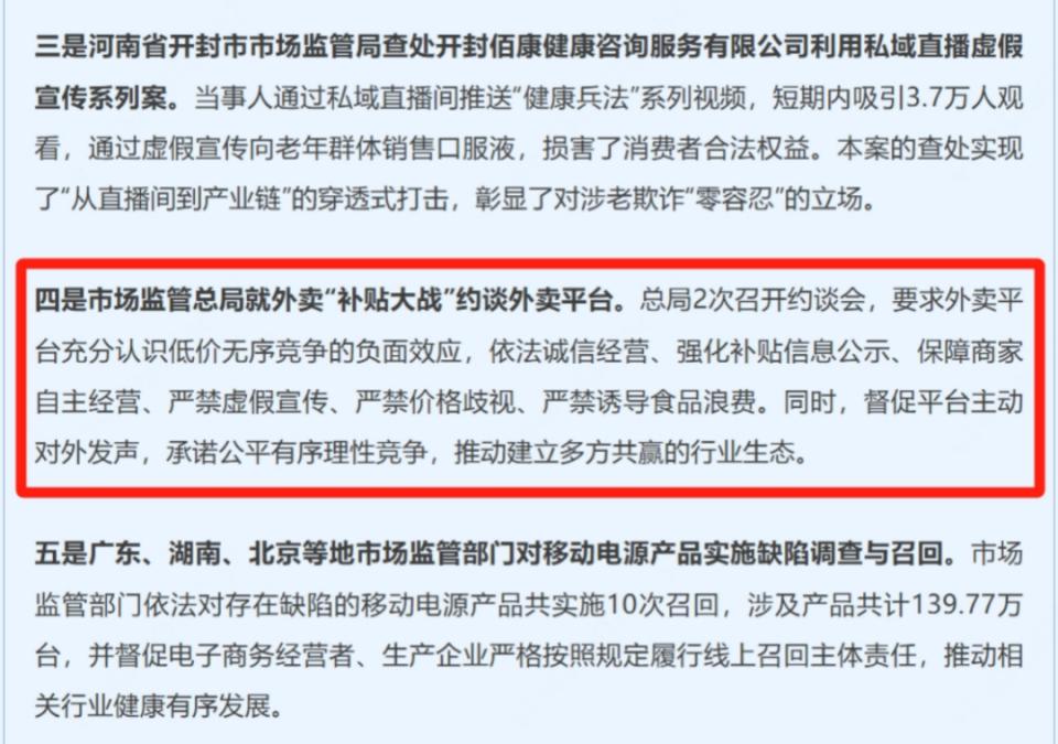 1 月 9 日,国务院反垄断反不正当竞争委员会办公室(双反办)宣布对外卖行业竞争开展调查评估。11 天后,国家发改委明确表态"依法治理低价无序竞争"。21 日,国家市场监管总局公布 2025 年综合整治"内卷式"竞争十大典型案例,外卖"补贴大战"遭约谈位列第四。