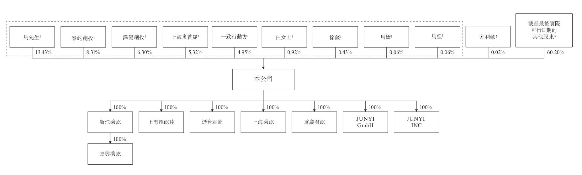 IPO前,上海君屹执行董事及控股股东马翌鑫、其配偶白女士以及彼控制的上海奥普晟、其兄弟姐妹马强及马娇、一致行动方及彼控制的实体(即泰屹创投及泽健创投)有权合共行使公司全部投票权的约39.79%。