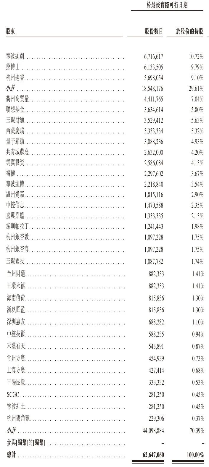 通用技术集团持股为9.13%,德丰杰持股为8.12%,嘉善国科持股为4.28%,国科经开持股为3%,中小企业发展基金持股为3.52%,毅达新烁持股为2.74%,深港科创持股为2.57%,华研智能持股为1.71%,国盈君和持股为0.09%,耕耘新创持股为1.89%,烟台源禾持股为1.29%。
