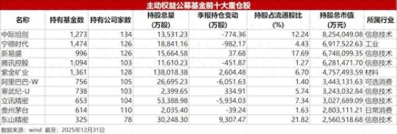截至2025年四季度末,主动权益基金前十大重仓股依次为中际旭创、宁德时代、新易盛、腾讯控股、紫金矿业、阿里巴巴-W、寒武纪-U、立讯精密、贵州茅台、东山精密,覆盖信息技术、工业、材料、消费等多个赛道。