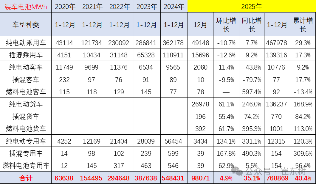 2025年12月的电池装车增长达到35%,其中商用车增长较强,尤其是12月的纯电动货车猛涨246%,而插混货车增长74%。