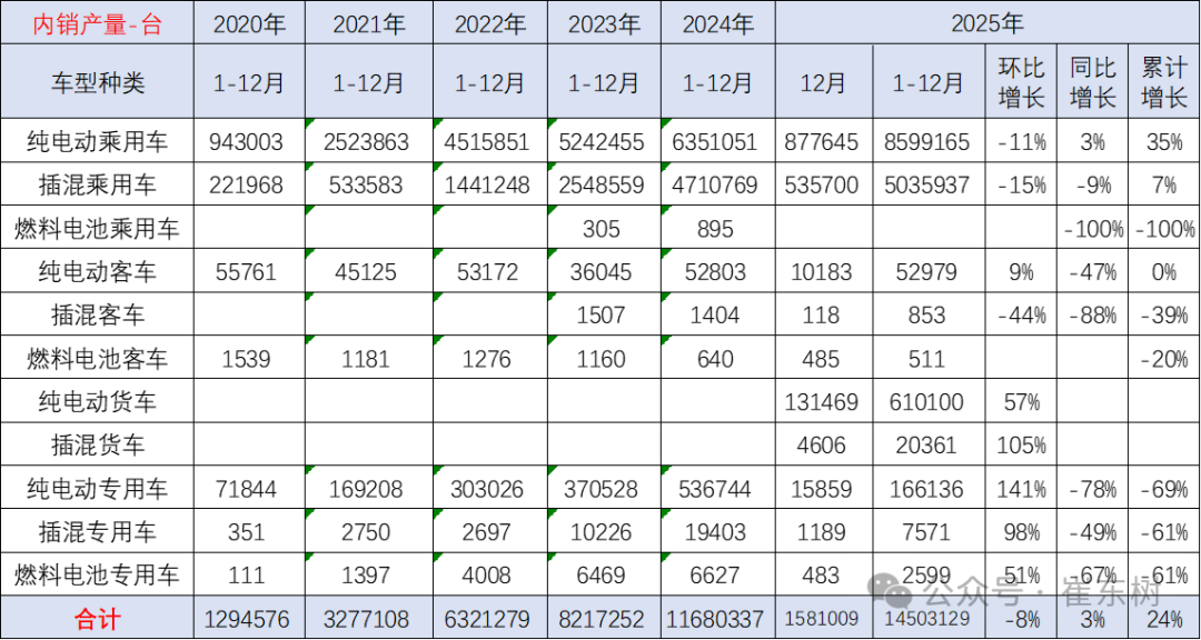 2025年1-12月新能源车国内合格证1450万台、同比增24%较强,其中纯电动乘用860万台、同比增35%;插混乘用车503万台、同比增7%;纯电动专用车和货车78万台,这样的产量数据表现很强。