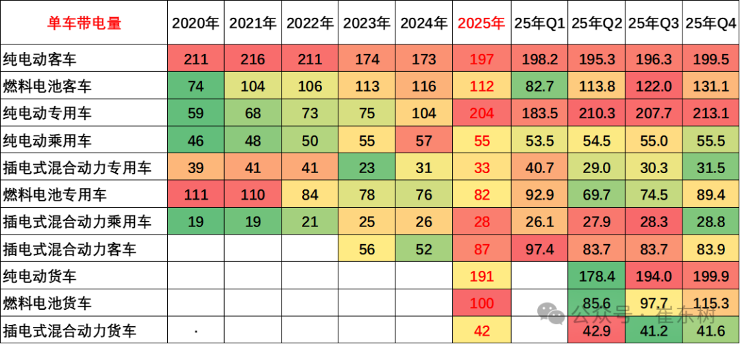 2025年4季度的电池能量密度160以上的车型占比10%,相对于2024年的13%出现了明显的下降,这主要还是磷酸铁锂电池对三元替代带来的能量密度下降。而125以下的能量密度的产品2025年下降到了1%的比例。