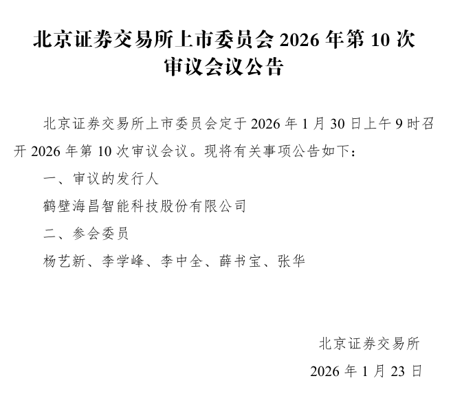 【大河财立方消息】1月24日消息,北交所上市委员会定于2026年1月30日上午9时召开2026年第10次审议会议,审议鹤壁海昌智能科技股份有限公司(以下简称鹤壁海昌智能)等发行人首发事项。