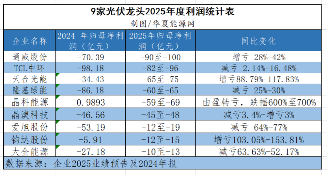华夏能源网(公众号hxny3060)统计发现,2025年,仅通威股份(SH:600438)、TCL中环(SZ:002129)、天合光能(SH:688599)、隆基绿能(SH:601012)、晶科能源(SH:688223)晶澳科技(SZ:002459)、爱旭股份(SH:600732)、钧达股份(SZ:002865)、大全能源(SH:688303)这9家光伏龙头预亏就合计超过435亿元,最高或达500亿元。
