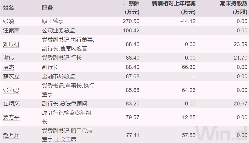 我们以2024年为例,当年薪酬最高是时任职工监事张湧(同时也是北京分行党委书记和行长,非一般“职工”),超过270万元;业务总监汪素南薪酬106万元,其余高层都低于百万元,谢伟薪酬和康杰一样,都是88.4万元。