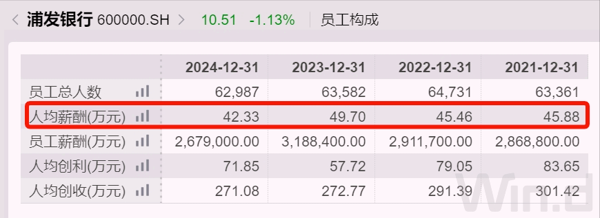 相对高层薪酬“低调”,浦发银行职工整体薪酬就不算低了。2024年末,该行职工总数近6.3万人,略有减员,实现人均创利约72万元,人均税前薪酬42.3万元,比2023年减少7.6万元左右,大约是谢伟薪酬的一半。