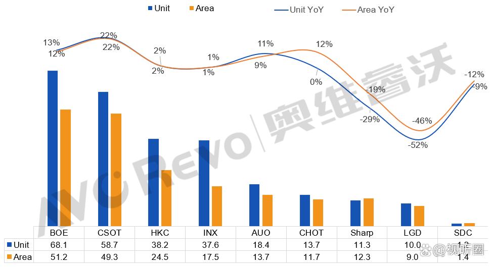 其中,其中京东方,全年出货68.1M,同比增长13%,出货面积51.2M㎡,同比增长12%,市占率26%,出货量与出货面积均排名第一。