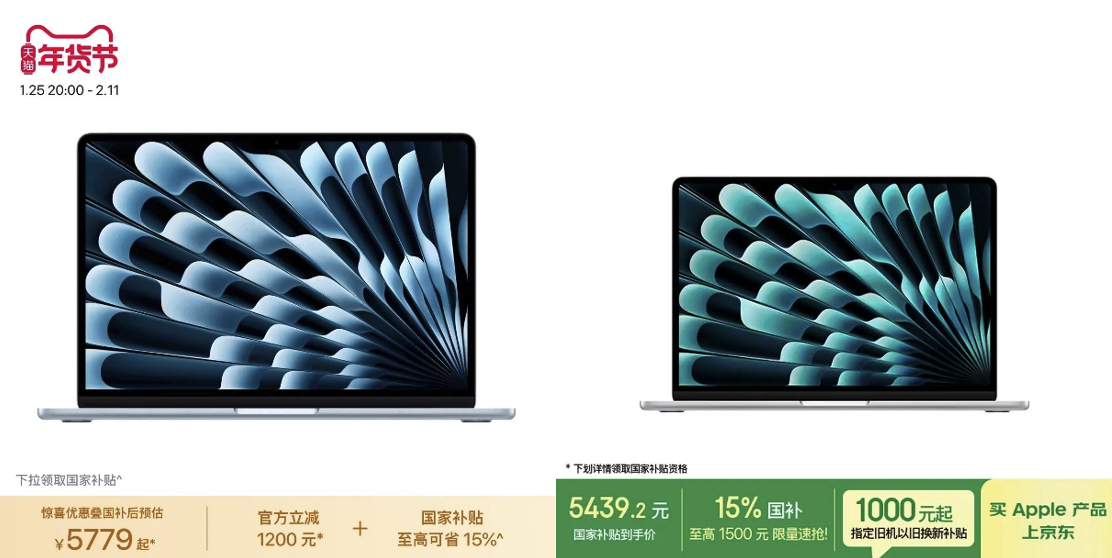 笔记本电脑方面,配备M4芯片的13英寸MacBook Air在京东Apple产品年货节可享15%国补,到手价为5439.2元;天猫则为官方立减1200元后叠加国补,到手价为5779元,两者差价近340元。