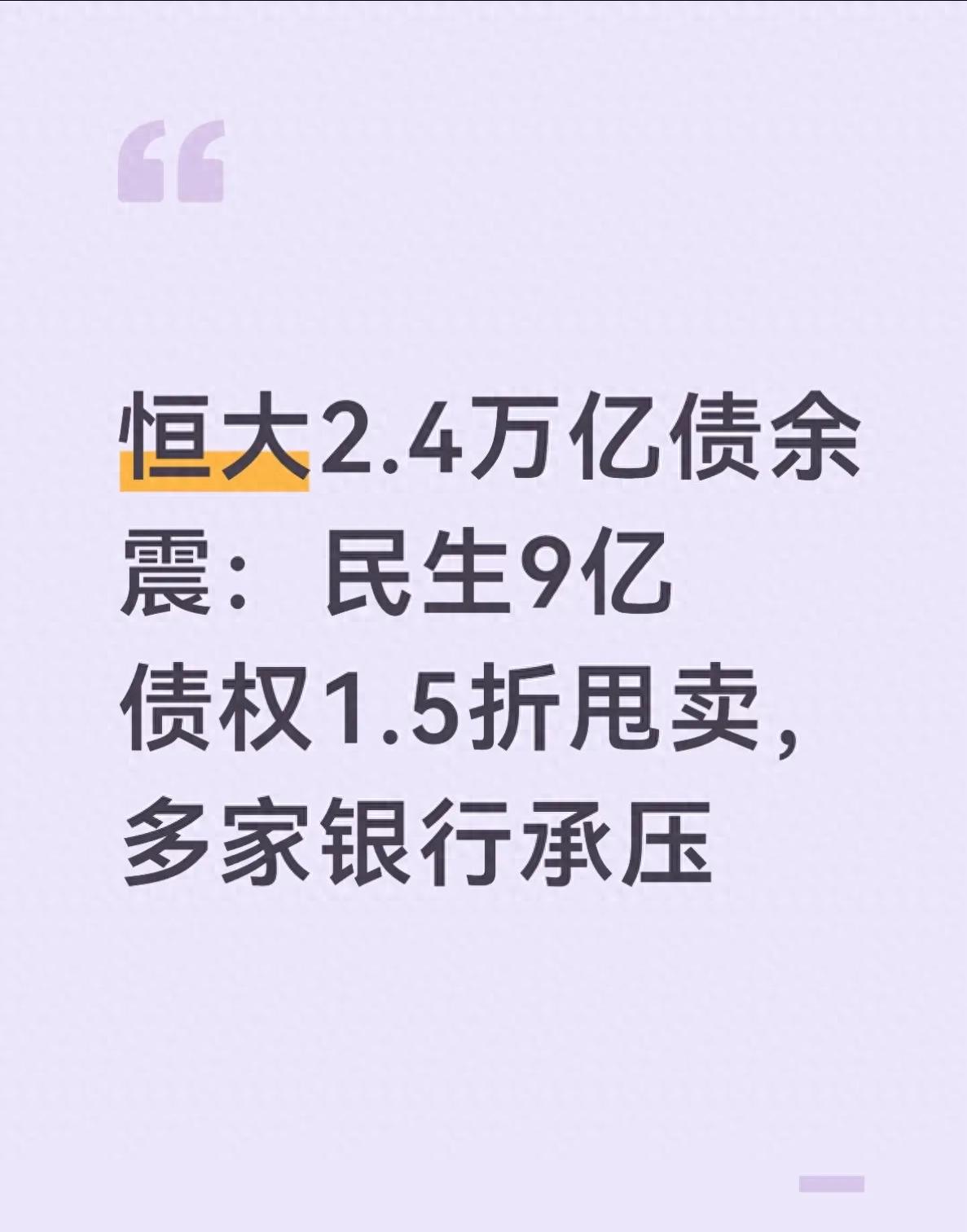 恒大2.4万亿债余震:民生9亿债权1.5折甩卖,多家银行承压