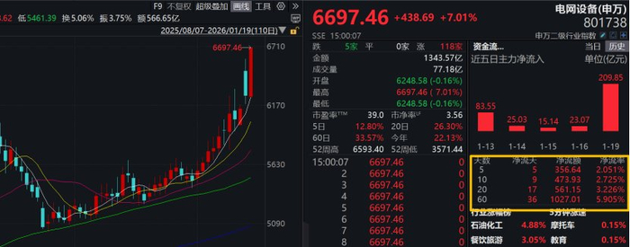 主力资金对电网设备方向也是持续抢筹,近10好交易日连续9天净流入,合计净流入473亿元。1月19日当日净流入超200亿元。