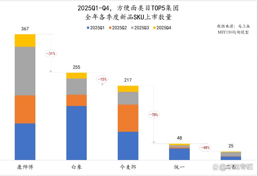 在方便面业务板块,康师傅虽在市场占有率、新品上市数量上稳居行业第一,却难掩增长乏力的困境。马上赢监测数据显示,2025年康师傅全年上新新品SKU达367款,大幅领先白象、今麦郎等竞争对手。