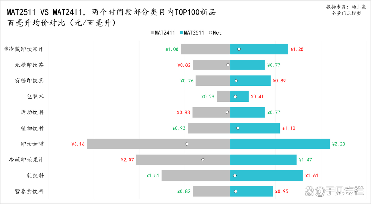 尤其是2025年新茶饮作为外卖混战的主战场,对传统软饮料形成了显著的价格挤压。马上赢数据显示,即饮咖啡百毫升均价从2024年的3.16元降至2025年的2.20元,冷藏即饮果汁从2.07元降至1.47元,降幅均达29%,成为行业内降价最明显的两大品类。