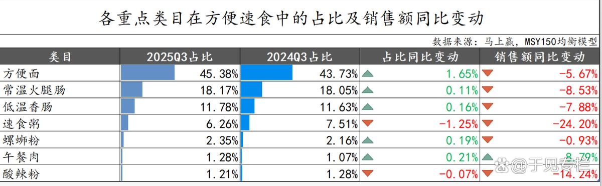 2025年Q3,受外卖行业竞争混战影响,速食品类中仅午餐肉实现占比与销售额双增长,其余品类均出现不同程度下滑,其中方便面销售额同比下滑5.67%。即便到了Q4,在外卖竞争相对缓和的背景下,方便面销售额及在速食品类中的占比仍双双下滑,行业整体进一步迈入存量竞争的博弈阶段。