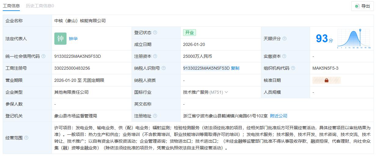 1月20日,中核(象山)核能有限公司注册成立。据工商信息,注册资本2.5亿元人民币,经营范围包括发电、输电、供(配)电业务,检验检测,热力生产和供应以及发电技术服务等。