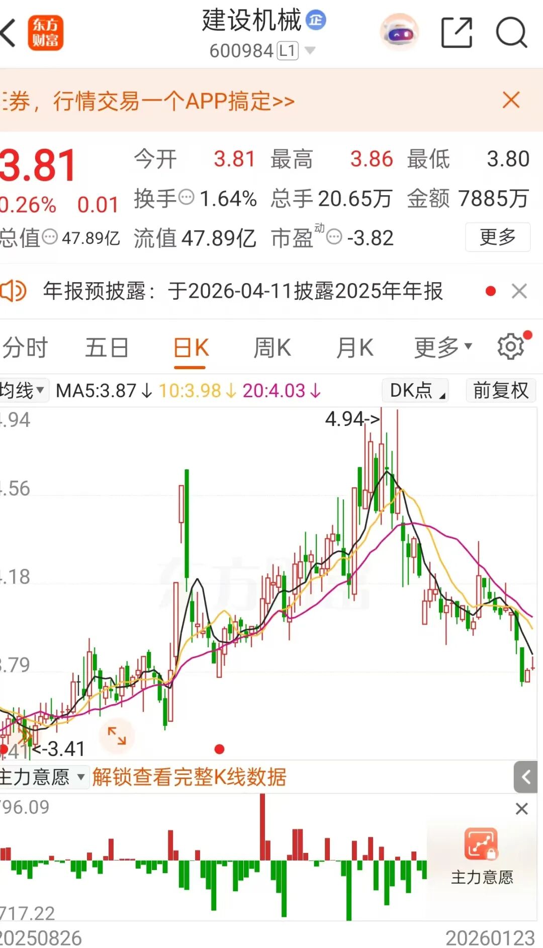 截至1月23日收盘,建设机械报3.81元/股,总市值为47.89亿元。