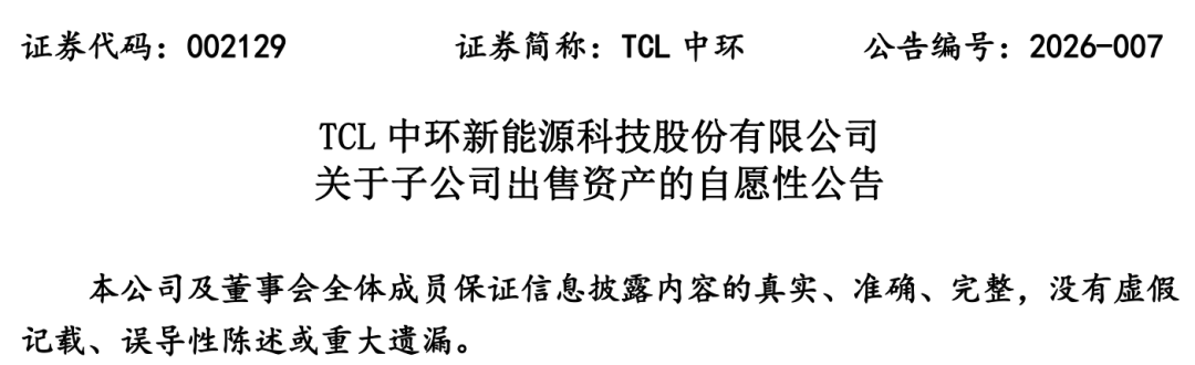 1月24日,TCL中环发布关于子公司出售资产的自愿性公告。