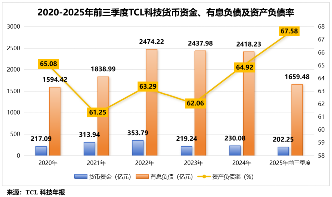 前前后后,TCL科技预估的总“支出”已经超过700亿元!值得注意的是,截至2025年三季度末,TCL科技货币资金仅202.25亿元;而有息负债却高达1659.48亿元,是公司货币资金的整整8倍多。同期,公司的资产负债率已从2021年的61.25%增长至67.58%。