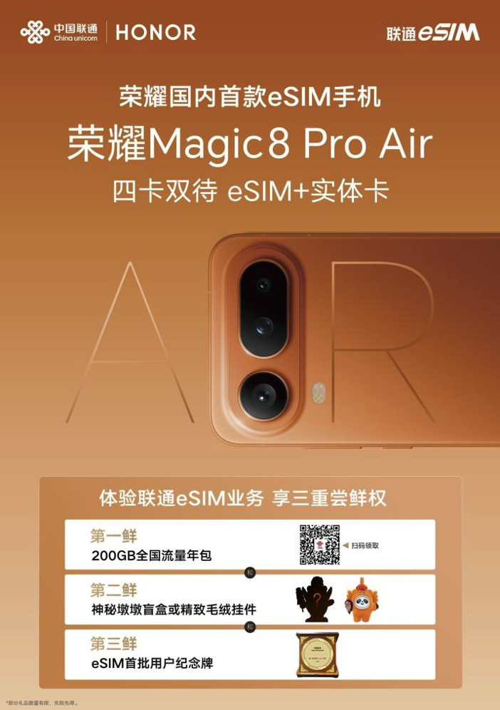 1月23日,2026年国内首款eSIM手机荣耀Magic8 ProAir在京东正式开售。当天,中国联通在北京西单营业厅举办“中国联通eSIM尝鲜季——2026首款eSIM手机荣耀Magic8 ProAir首销仪式”,中国联通、荣耀、京东三方相关负责人齐聚现场,共同见证这一重要时刻。作为2026年行业首款由厂商、渠道、运营商深度协同,共同推动的eSIM手机新品,其一经发布就广受消费者青睐。这也标志着中国联通、荣耀、京东三方在eSIM领域的战略合作正式迈入全新阶段。荣耀Magic8 Pro Air以“Pro in theAir”为产品理念,在延续旗舰性能与体验水准的同时,进一步压缩机身厚度与重量,155克的极致轻薄机身,重新定义了高端直板手机在轻薄形态下的体验边界。同时,荣耀 Magic8 ProAir支持eSIM与实体SIM卡灵活组合,具备四卡双待能力,极大提升了消费者用卡自由度与跨场景通信灵活性,也为eSIM在智能手机中的实际应用提供了清晰参考。为让用户充分体验eSIM技术带来的便捷,京东与中国联通推出“e补”三重价值权益政策,涵盖话费即时到账、200G全国流量全年畅享、出境商旅线上便捷办理等实用服务。1月23日-2月28日活动期间,消费者在京东购买荣耀Magic8 ProAir,并在线下营业厅开通eSIM业务(包括开新卡、eSIM转eSIM、携号转网并开通eSIM等),均可获得200G全国通用流量年包,以及毛绒挂件等多重好礼。作为国内eSIM领域的先行者与核心推动者,中国联通持续完善从营销推广到平台支撑、再到服务保障的整体体系,推动eSIM手机在市场端加快落地。2025年以来,中国联通已与Apple、华为、OPPO三大主流厂商达成深度合作,完成iOS、鸿蒙、安卓三大移动生态的eSIM终端布局,为用户带来多元选择以及全场景的智慧通信服务体验。联通华盛总经理李立新表示,中国联通与荣耀、京东长期以来携手并进、协同发展,形成了坚实的合作伙伴关系。她坚信,在三方的协同赋能与深耕细作下,国内eSIM手机市场必将迎来更广阔的发展空间。作为消费者信赖的3C数码选购渠道,京东多年来依托强大的供应链优势,不断携手荣耀、中国联通等上下游合作伙伴,推动产品创新和服务升级,为用户带来先人一步的尝新体验。此次以荣耀Magic8 ProAir手机为基础,三方在eSIM领域构建起了从权益定制,到新品上市,再到号卡开通的全链路产品共建模式。未来随着京东、中国联通、荣耀三方在eSIM终端战略合作的持续深化,国内eSIM智能手机规模化商用进程也将进一步提速,以用户为中心的全场景智慧通信体验时代也将加速到来。目前,荣耀Magic8 ProAir系列已在京东正式开售,起售价4999元,国补后到手价4499元起。除此之外,京东还为消费者打造了荣耀Magic8 ProAir专属购机权益,支持24期免息,以旧换新至高补贴1200元,另外还额外赠送1年碎屏宝、1年后盖宝、2年电量宝权益,前1000名PLUS用户赠送扩香石礼盒,晒单评价至高赢100元E卡等多种权益。