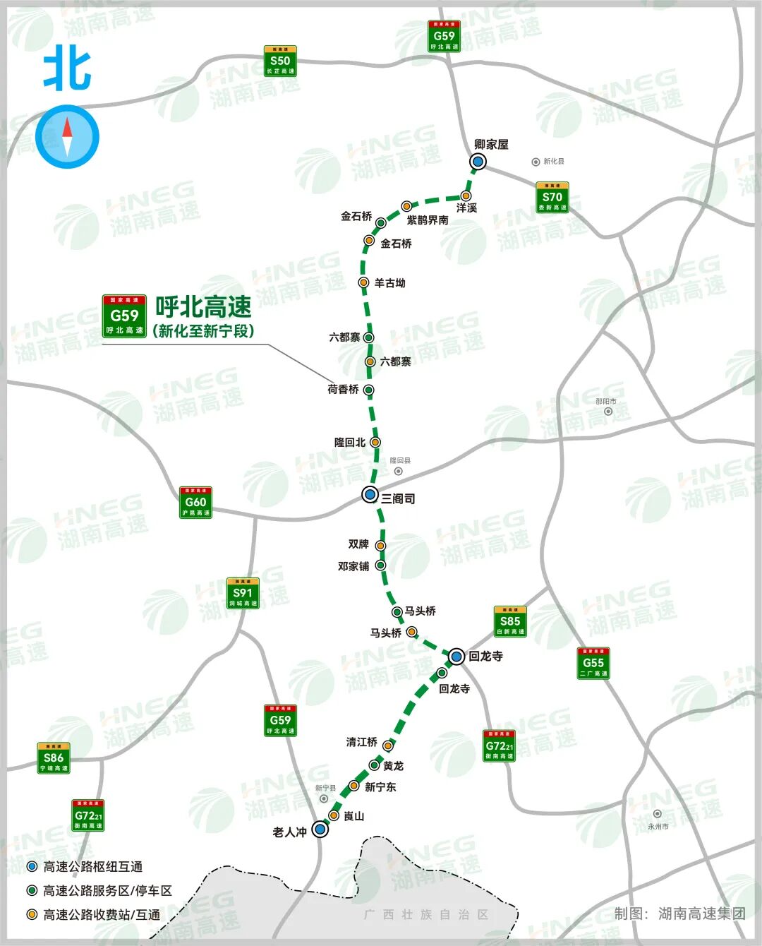 G59呼北高速新化至新宁段,北起湖南娄底市新化县青山乡卿家屋,途经娄底市新化县,邵阳市隆回县、武冈市、邵阳县、新宁县,止于邵阳市新宁县老人冲,主线全长192.564公里,同步建设地方连接线83.7公里,采用双向四车道标准设计,其中K0至K32+100采用单一限速100公里/小时,其余路段则采用分车型限速,客车120公里/小时,其他车型100公里/小时。全线共设有15处互通立交、4对服务区、3处停车区、11处收费站。