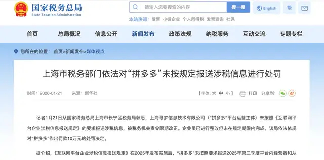 1月21日,上海税务部门披露,在《互联网平台企业涉税信息报送规定》实施后,拼多多未能按要求报送2025年第三季度的相关涉税信息。尽管在收到责令改正通知后进行了整改,但并未在规定期限内完成。