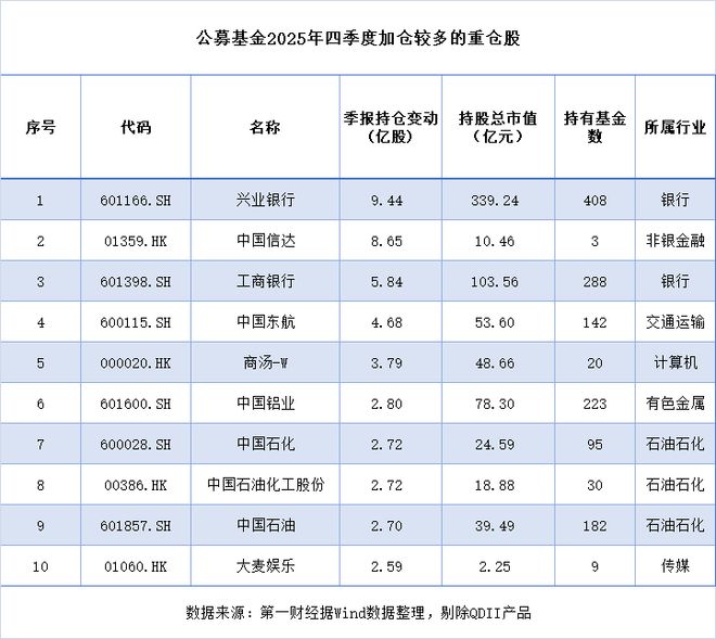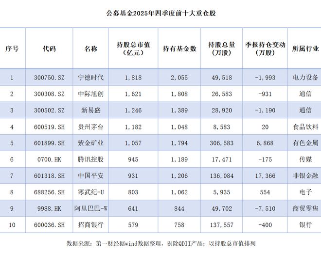 数据显示,截至2025年四季度末,公募基金(剔除QDII产品)共计重仓3191只个股,较上一季度增加83只。若从基金持股总市值的角度看,前十大重仓股变动并不大,但个股排序出现明显调整。