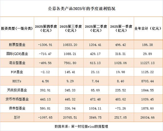 数据显示,2025年四季度,公募基金利润亏损近1100亿元,这是行业连盈七个季度之后的首次亏损。不过,凭借前三季度的强势表现,公募基金全年狂揽2.6万亿元利润,不仅刷新历史峰值,更一举填平了2022年以来的亏损。