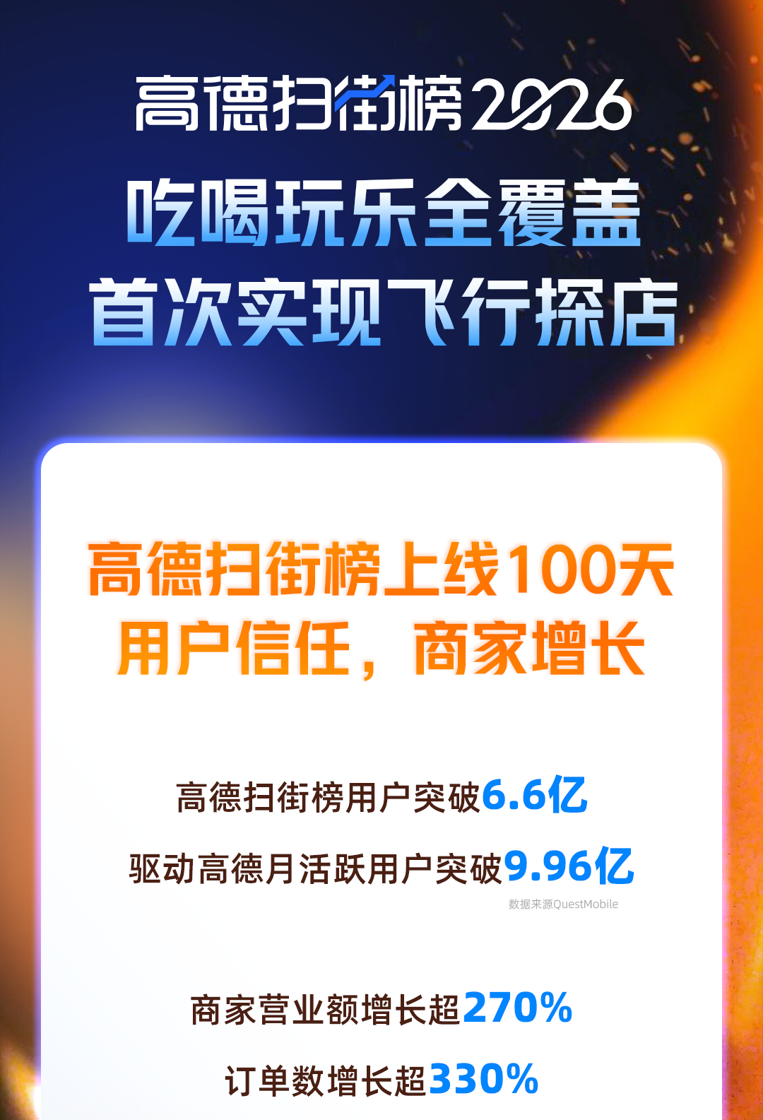 上线100天以来,高德扫街榜已吸引86万新商家入驻,商家订单量和营业额环比增长均超300%。同时,QuestMobile数据显示,高德扫街榜已推动高德地图月活达9.96亿。此外,飞行街景、动态时令榜单等功能升级,进一步赋能商家发展。