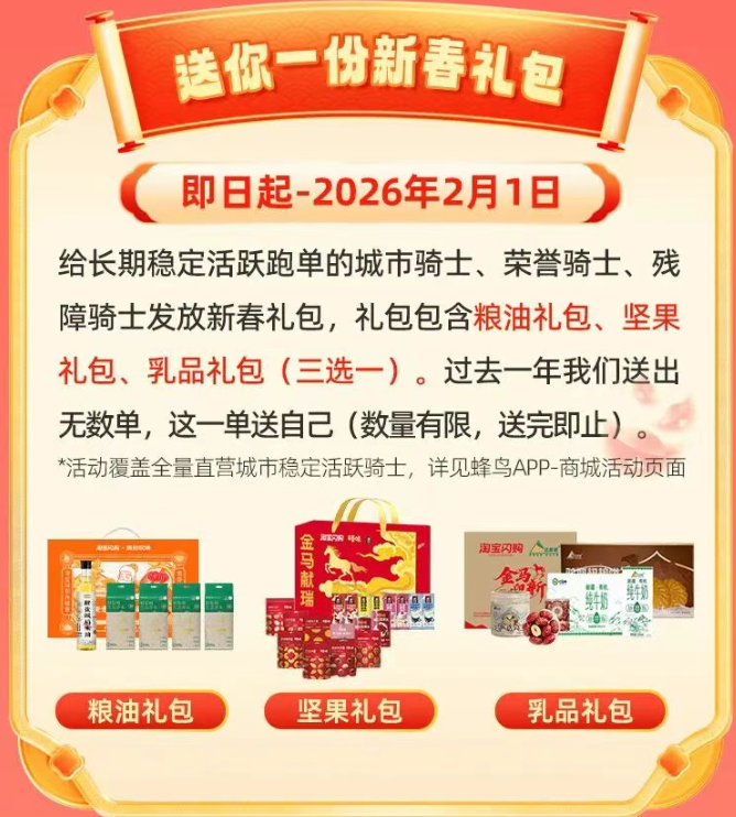 值得一提的是,春节期间淘宝闪购将开启线上17日骑手日狂欢活动,各种好礼不断;骑士商城中的商品也给出了不同程度的折扣;针对长期稳定活跃跑单的城市骑手、荣誉骑士、残障人士,淘宝闪购给送出了粮油礼包、坚果礼包、乳品礼包(三选一)的福利。