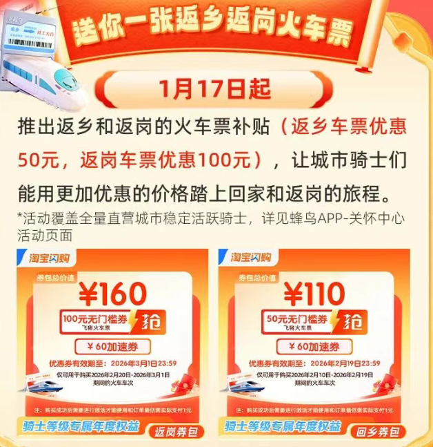 坚守岗位的骑手除外,淘宝闪购也为返乡的骑手准备了福利。1月17日起,推出返乡和返岗的火车票补贴。