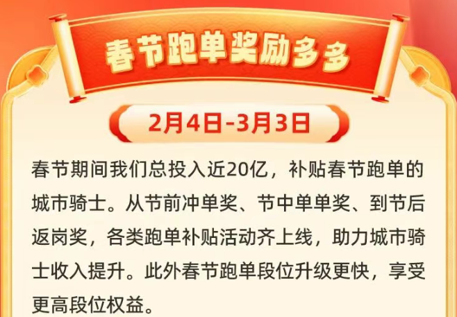 针对春节跑单的城市骑手,淘宝闪购将投入近20亿元的补贴,覆盖 2 月 4 日- 3 月 3 日全周期跑单奖励。补贴主要以节前冲单奖、节中冲单奖、节后冲单奖的形式发放,切实提高骑手收入。