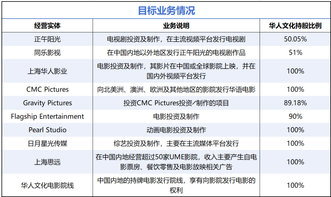 此次华人文化计划将旗下的核心影视及院线资产置入邵氏兄弟,公告显示,相关资产主要包括知名剧集制作公司正午阳光、影视发行公司同乐影视、电影投资制作公司上海华人影业、综艺制作公司日月星光传媒,以及运营超50家UME影城的上海思远等。